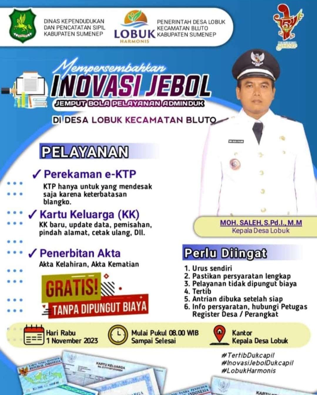 Untuk mempermudah dan memberi ruang kepada masyarakat yang ingin membuat baru maupun melakukan perubahan data kependudukan, Pemerintahan desa Lobuk Kecamatan Bluto meluncurkan Program inovasi Jemput Bola Pelayanan Administrasi Kependudukan atau disingkat Jebol Adminduk.