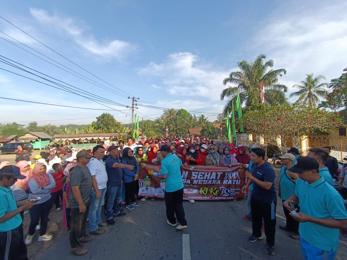 Jalan sehat yang dimulai pukul 07:00 Wib. star dari dusun pemekaran, melintasi jalan utama dan finis di lapangan kantor desa negara ratu.