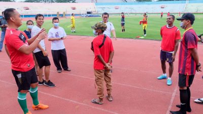 Kapolresta Sidoarjo Komisaris Besar Polisi Sumardji mengajak pelajar Papua, ikut sepak bola bersama pejabat utama Polresta Sidoarjo di Stadion Gelora Delta, Sidoarjo, Kamis (15/4/2021) sore.