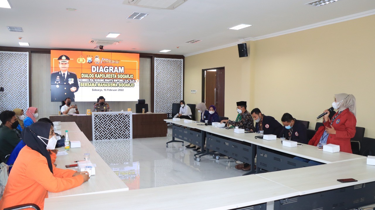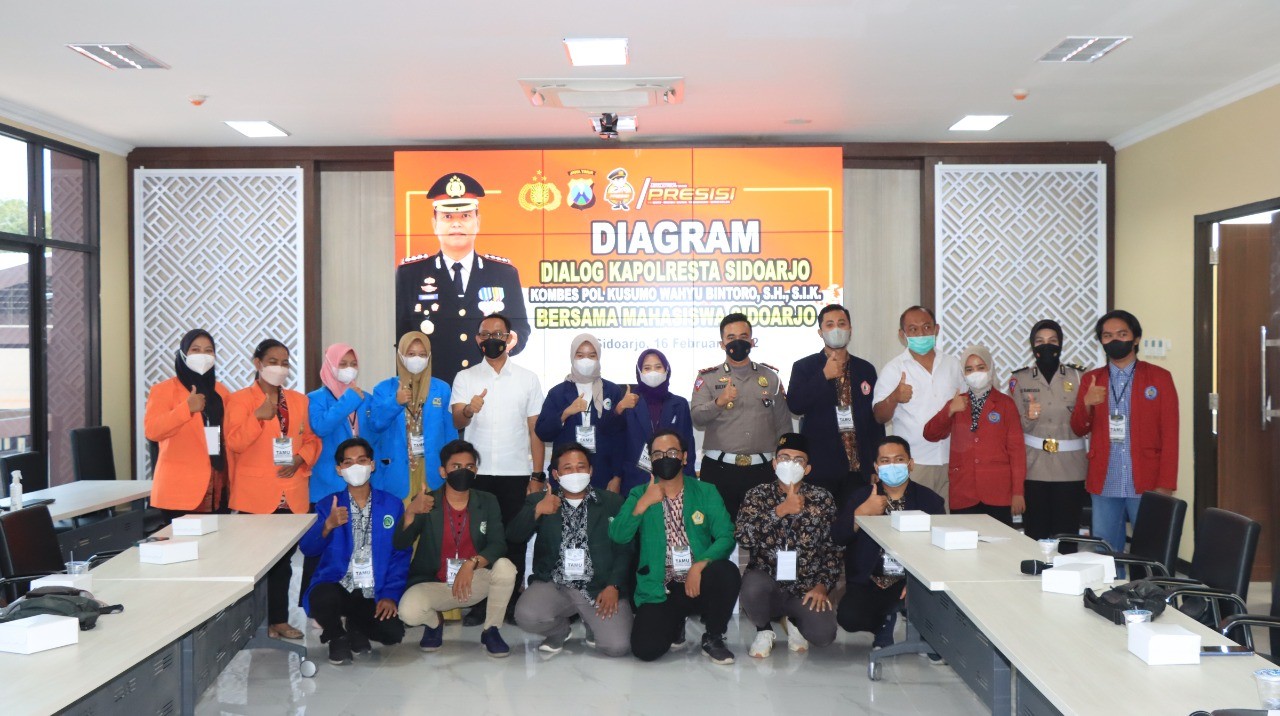 Menjaga sinergitas Polri dan mahasiswa yang sudah terjalin dengan baik, Rabu (16/2/2022) bertempat di Ruang Parahita Raksasa Polresta Sidoarjo, berlangsung pertemuan Diagram Kapolresta Sidoarjo bersama mahasiswa Sidoarjo.