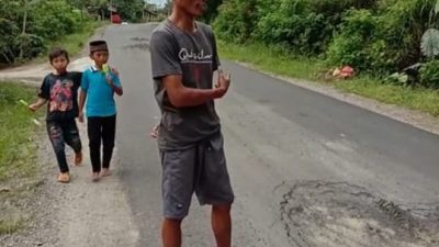 Pengendara mobil atau motor harus ekstra hati hati, sepanjang kurang lebih 900m jalan penuh dengan lubang.