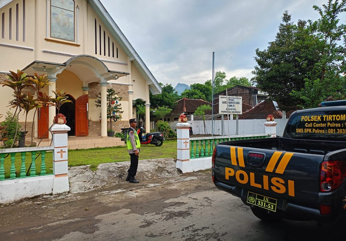 Salah satu kegiatan pengamanan dilaksanakan oleh jajaran Polsek Tirtomoyo pada Minggu (21/12/2025) pagi. Dipimpin langsung Kapolsek Tirtomoyo IPTU Yuni Tri Suwarno Putra, S.H., M.H., personel melakukan patroli dan pengamanan ibadah Minggu di beberapa gereja, di antaranya Gereja Katolik St. Yohanes Rosul dan Gereja Kristen Jawa di wilayah Kecamatan Tirtomoyo. Kegiatan ibadah berlangsung tertib dengan jumlah jemaat mencapai ratusan orang.