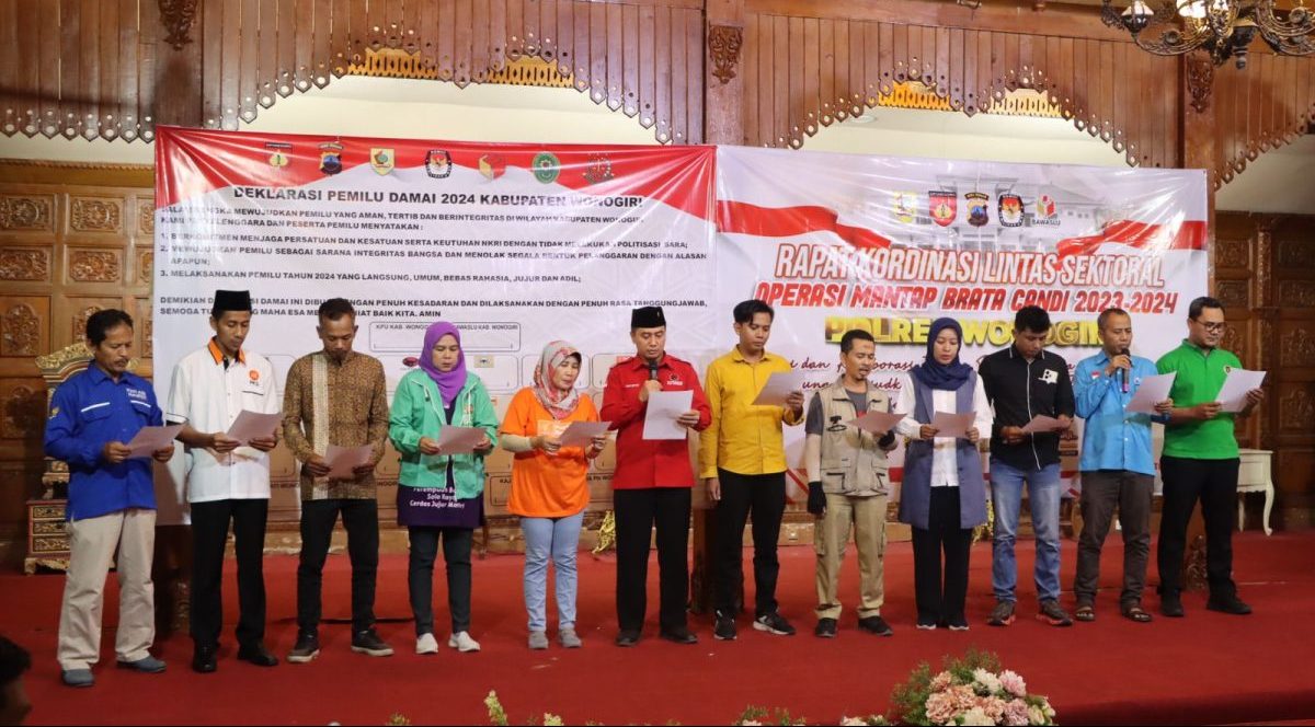 Deklarasi Pemilu damai dihadiri perwakilan Parpol peserta Pemilu di Kab. Wonogiri, Kapolres Wonogiri AKBP Andi Muhammad Indra Waspada Amirullah, SH., SIK., MM., MSi., Pasi Ops Kodim 0728 Wonogiri Kapten Inf Suradji, Kasi Pidum kejaksaan Negeri Wonogiri Christomy Bonar, S.H., Ketua PN Wonogiri Rois Torodji, SH., MH., Ketua KPU, Ketua Bawaslu, OPD Kepala Dinas dan PJU Polres Wonogiri serta Kapolsek jajaran Polres Wonogiri.