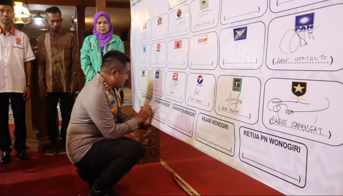 Sebagai bentuk komitmen para pimpinan partai politik beserta Forkopimda Kab Wonogiri, Ketua KPU dan ketua Bawaslu Kab. Wonogiri menandatangani papan deklarasi pemilu damai.