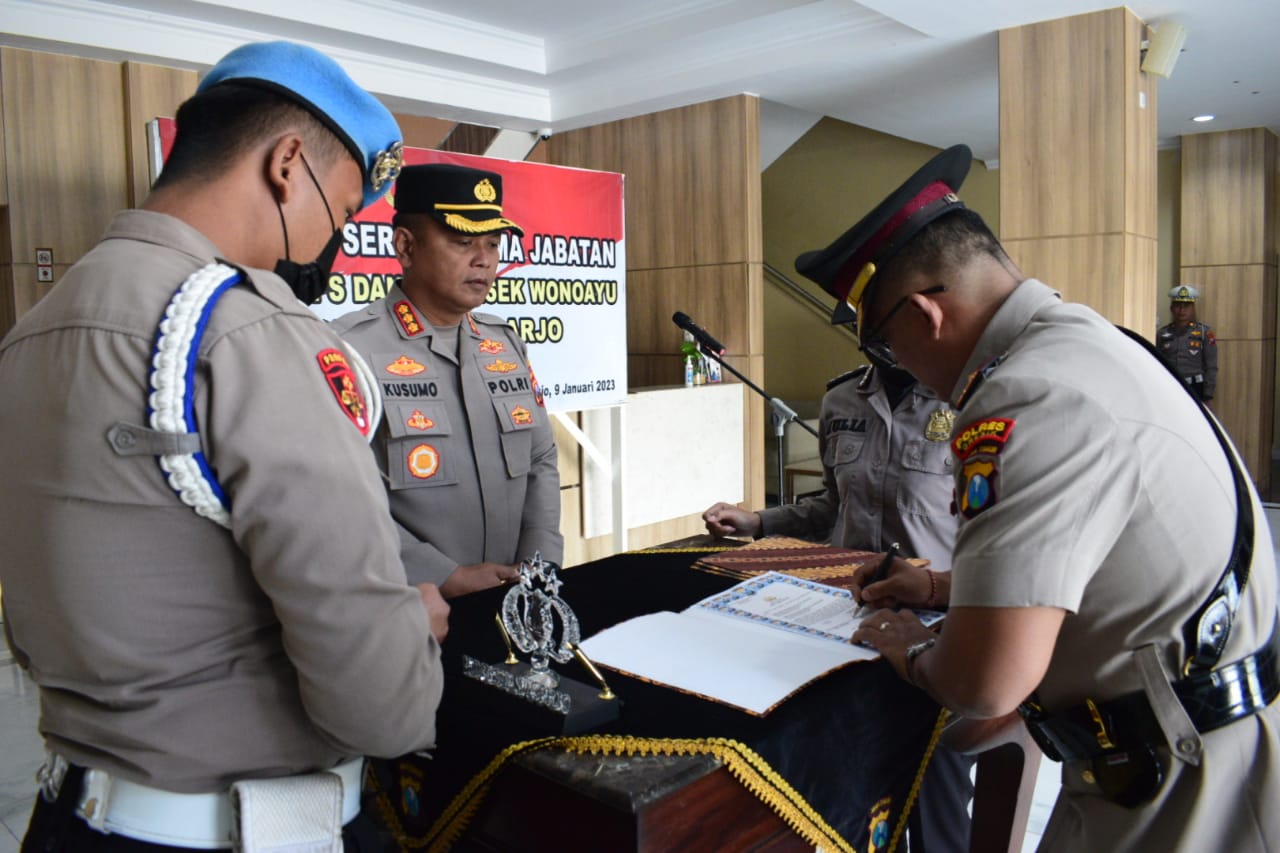 Kapolresta Sidoarjo Komisaris Besar Polisi Kusumo Wahyu Bintoro, Senin (9/1/2023) pagi, memimpin upacara serah terima jabatan (sertijab) Kabag Ops Polresta Sidoarjo dan Kapolsek Wonoayu.