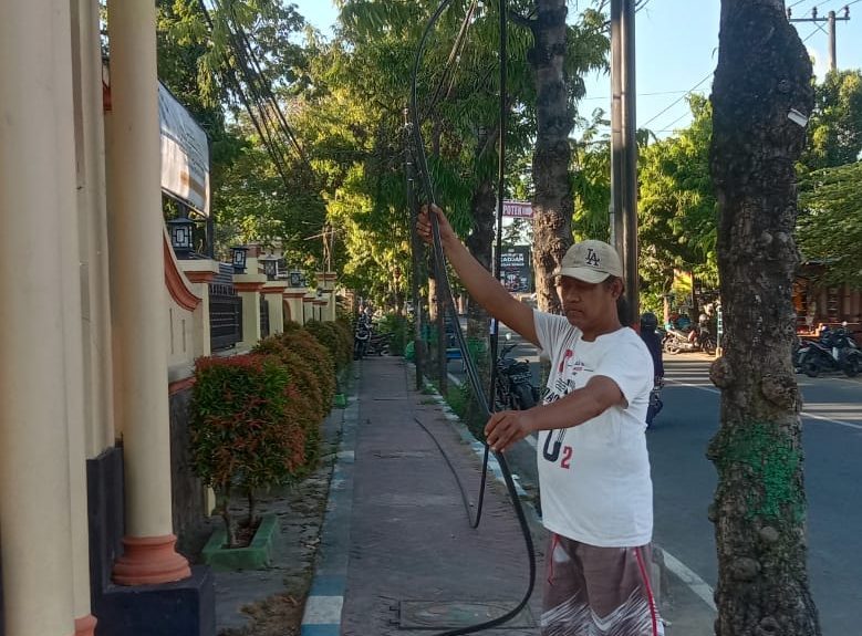 Tampak Kabel bergelantungan tertangkap kamera media, di lokasi Trotoar jalan depan Sekolah Madrasah Aliyah Negeri ( MAN ) Sumenep, sekira Pukul. 15.30 WIB, Senin, ( 09 / 07 / 24 ).