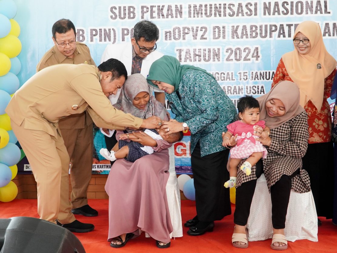 Mengantisipasi penyebaran virus menular Polio, Pemerintah Kabupaten Lamongan menargetkan seluruh anak di Lamongan usia 0-8 tahun kurang satu hari menerima vaksin polio melalui Sub Pekan Imunisasi Nasional (Sub – PIN) Polio novel Oral Polio Vaccine Tipe 2 (nOPV2) yang dilaksanakan secara serentak sewilayah Kabupaten Lamongan.