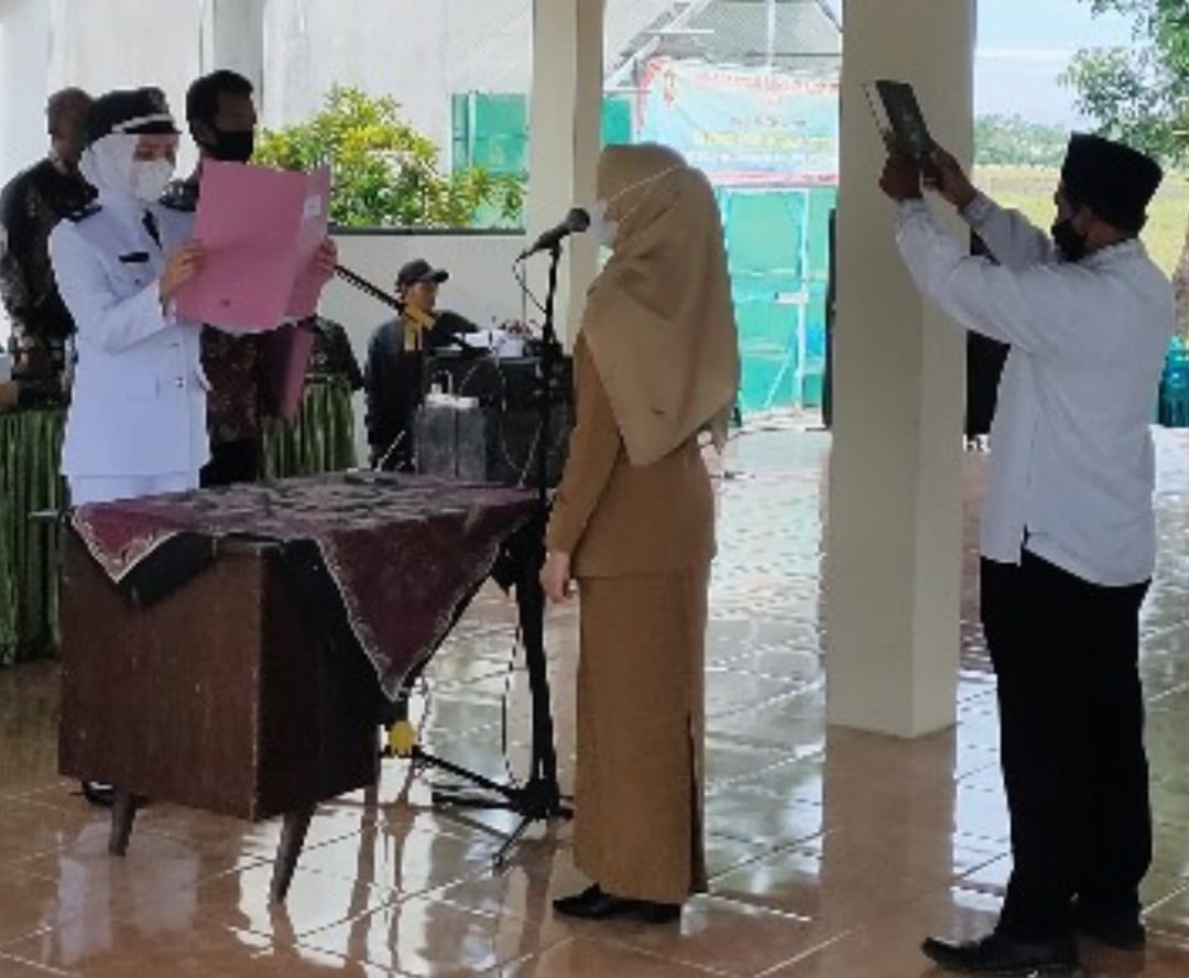 Kepala Desa Bicak Kecamatan Trowulan Kabupaten Mojokerto, Nn. Yunita Dwi Ratnasari melantik dan mengambil Sumpah Jabatan Sekretaris Desa (Carik Bicak) Dini Winantasari di Pendopo Balai Desa Bicak, Selasa ( 22/ 2/ 2022)