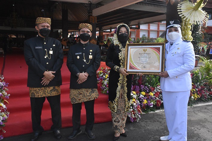 Kepala Desa Brangkal Nur Ely Nuryani memperoleh penghargaan Lunas PBB P2 dari Bupati Mojokerto dr Ikfina Fahmawati saat Upacara Hari Jadi Kabupaten Mojokerto