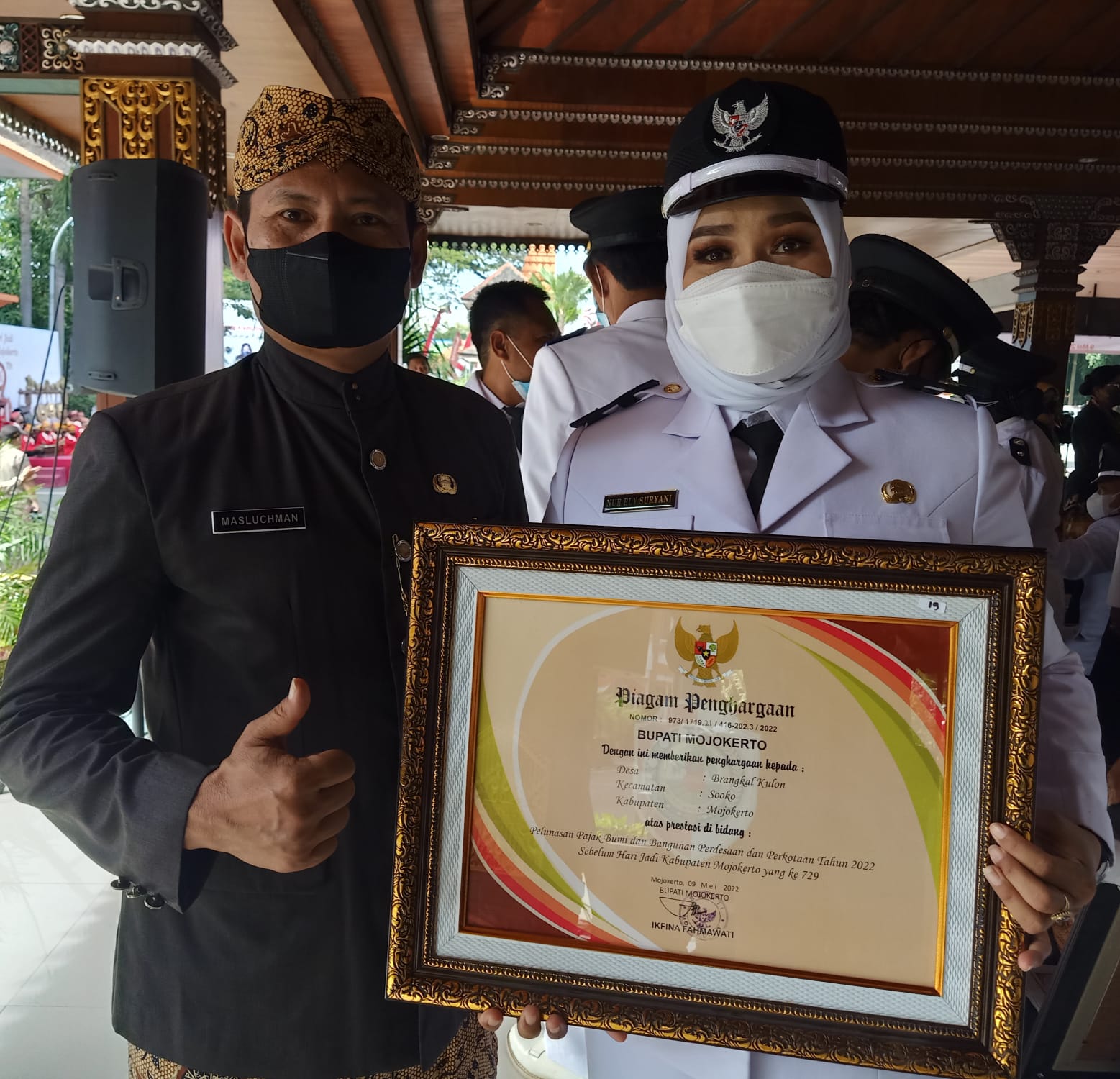 Camat Sooko Masluchman, S.Sos, M.Si, bersama Kepala Desa Brangkal Nur Ely Nuryani usai mendapatkan penghargaan Lunas PBB P2 dari Bupati Ikfina