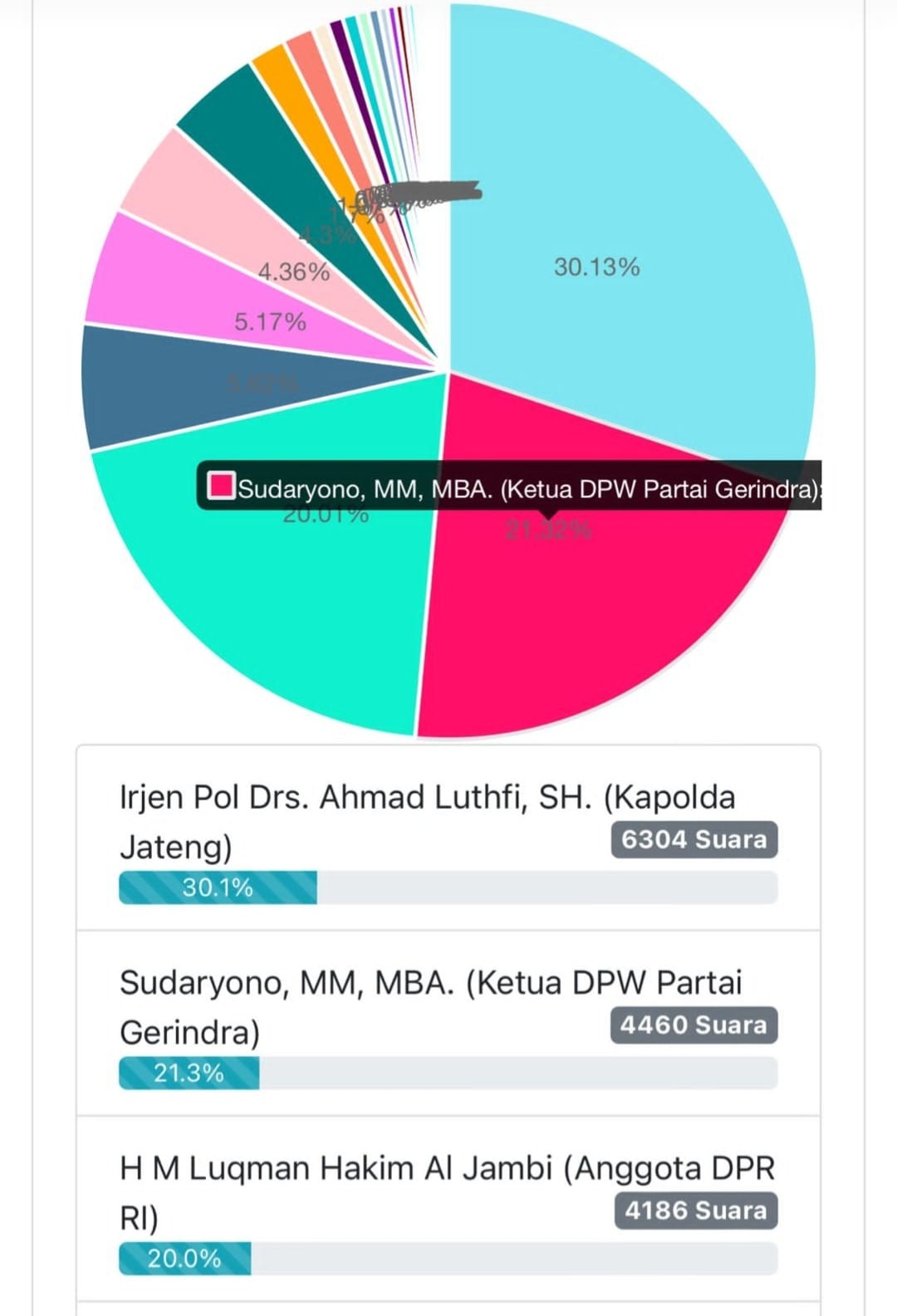 Kemudian diurutan kedua diraih Sudaryono yang saat ini menjabat Ketua DPW Gerindra Jateng dengan 10.244 suara atau atau 27,0 persen.