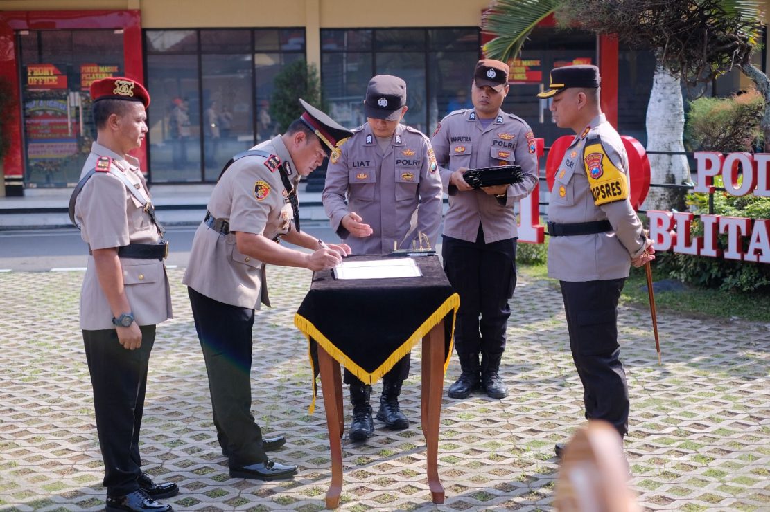 Kapolres Blitar Kota pimpin apel sekaligus serah terima jabatan (sertijab) Sejumlah pejabat utama (PJU), mulai dari PJU Kasat, Kabag hingga Kapolsek. Senin (14/5/2024).