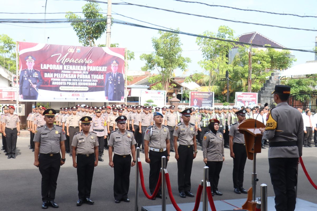 Sebanyak 59 personil Polres Bojonegoro yang terdiri dari Perwira 17 personil serta Bintara 42 personil mendapatkan kenaikan pangkat setingkat lebih tinggi berdasarkan prestasi, dedikasi, dan masa pengabdian mereka.