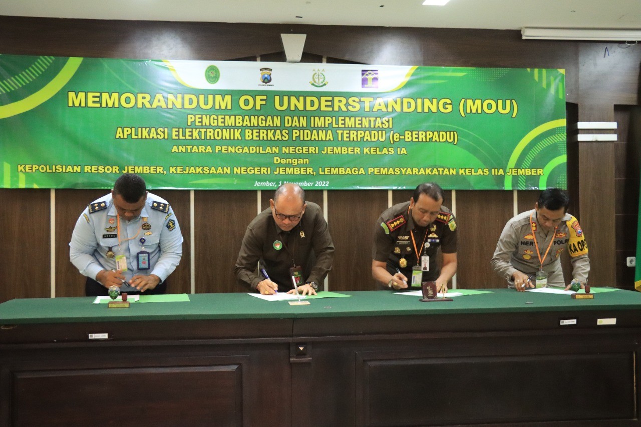 Di Indonesia sudah banyak tampak dilakukan kinerja yang berbasis IT dalam pengelolaan data, dokumen dan file. Begitupun dengan institusi penegak hukum di Kabupaten Jember. Hari ini dilakukan MOU (Memorandum Of Understanding) antara Pengadilan Negeri Jember, Kejari Jember, Kepolisian Resor Jember dan Lembaga Pemasyarakatan Kelas II A Jember. Selasa (01/11/2022)