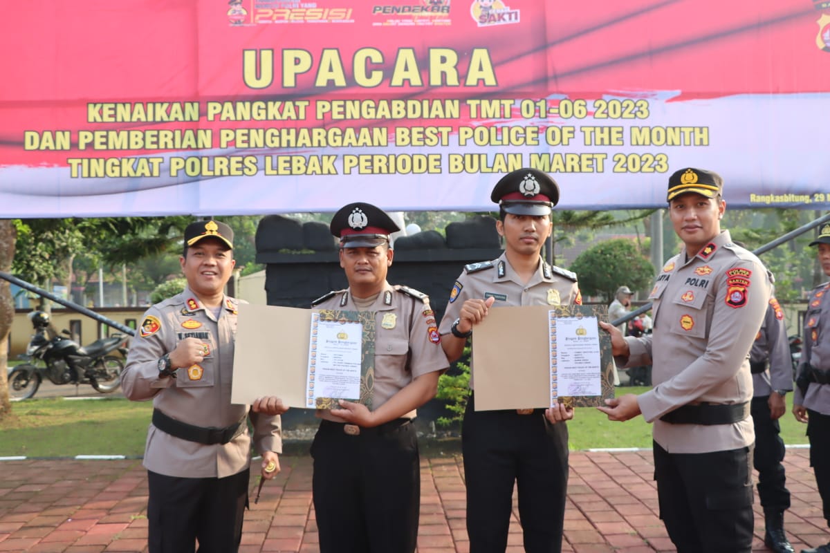 Personil yang mendapatkan Kenaikan Pangkat Pengabdian TMT 01 Juni 2023 yaitu Kompol Wawan Suhawan (Kapolsek Cibadak) dan Kompol Sudedi (Kapolsek Leuwidamar) sedangkan Pemberian Penghargaan Best Police Of The Month tingkat Polres Lebak Periode Bulan Maret 2023 diberikan kepada Bripka Sutardi (Bhabinkamtibmas Polsek Bayah) dan Briptu Tommy Saputra (Ba Sikeu Polres Lebak).