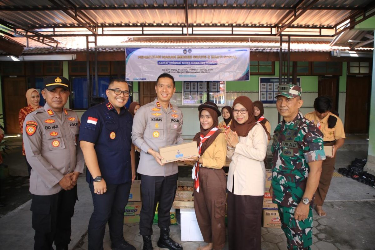 Kapolres Madiun AKBP Kemas Indra Natanegara, S.H., S.I.K., M.Si bersama jajaran Kantor Imigrasi Madiun melaksanakan kegiatan sosial berupa penyaluran bantuan sosial (bansos) dan program Makan Bergizi Gratis (MBG) di Sekolah Luar Biasa Negeri (SLBN) Banjarsari Wetan, Kamis (14/8/2025).