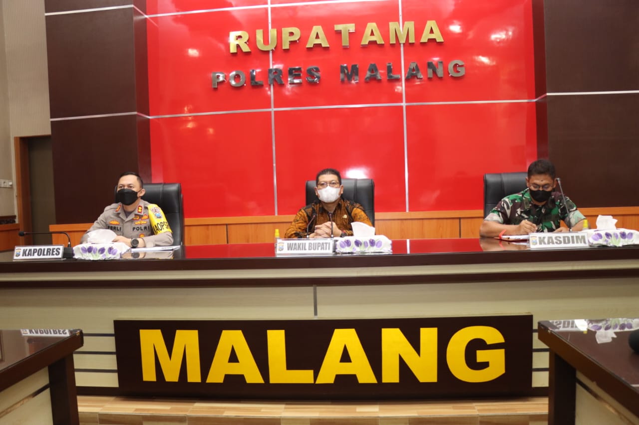 Kapolres Malang AKBP Ferli Hidayat bersama Pejabat Utama (PJU), mengikuti rapat koordinasi persiapan menghadapi Mudik Lebaran 2022 secara virtual dengan Kapolri Jenderal Listyo Sigit Prabowo di Rupatama Polres Malang, Kamis (14/4/2022)