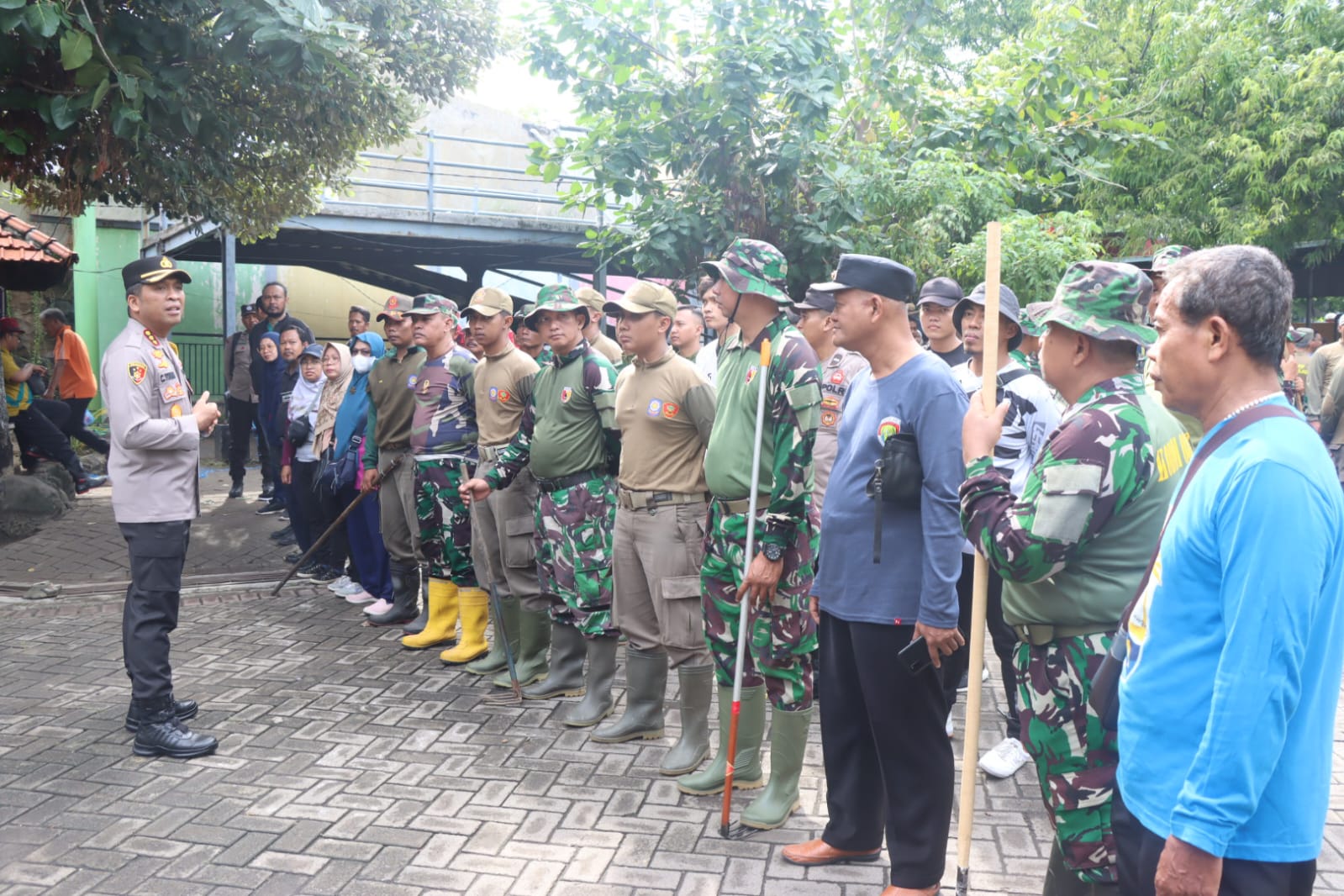 Pada kesempatan ini juga dilakukan kerja bakti bersama dari berbagai unsur terkait. Antara lain Polri, TNI, Satpol PP, Dinas Sosial, BPBD, serta jajaran pemerintah desa setempat. Kerja bakti dengan sasaran membersihkan sampah dan enceng gondok di sungai-sungai wilayah terdampak banjir.