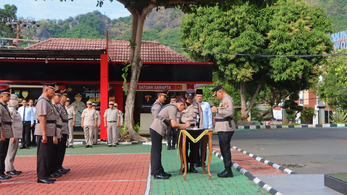Upacara di pimpin oleh Kapolres Wonogiri AKBP Andi Muhammad Indra Waspada Amirullah, S.H., S.I.K., M.M., M.Si., dan di ikuti oleh Wakapolres, PJU Polres Wonogiri serta personil Polres Wonogiri, diawali dengan pengambilan sumpah jabatan di lanjutkan penandatanganan berita acara serah terima jabatan