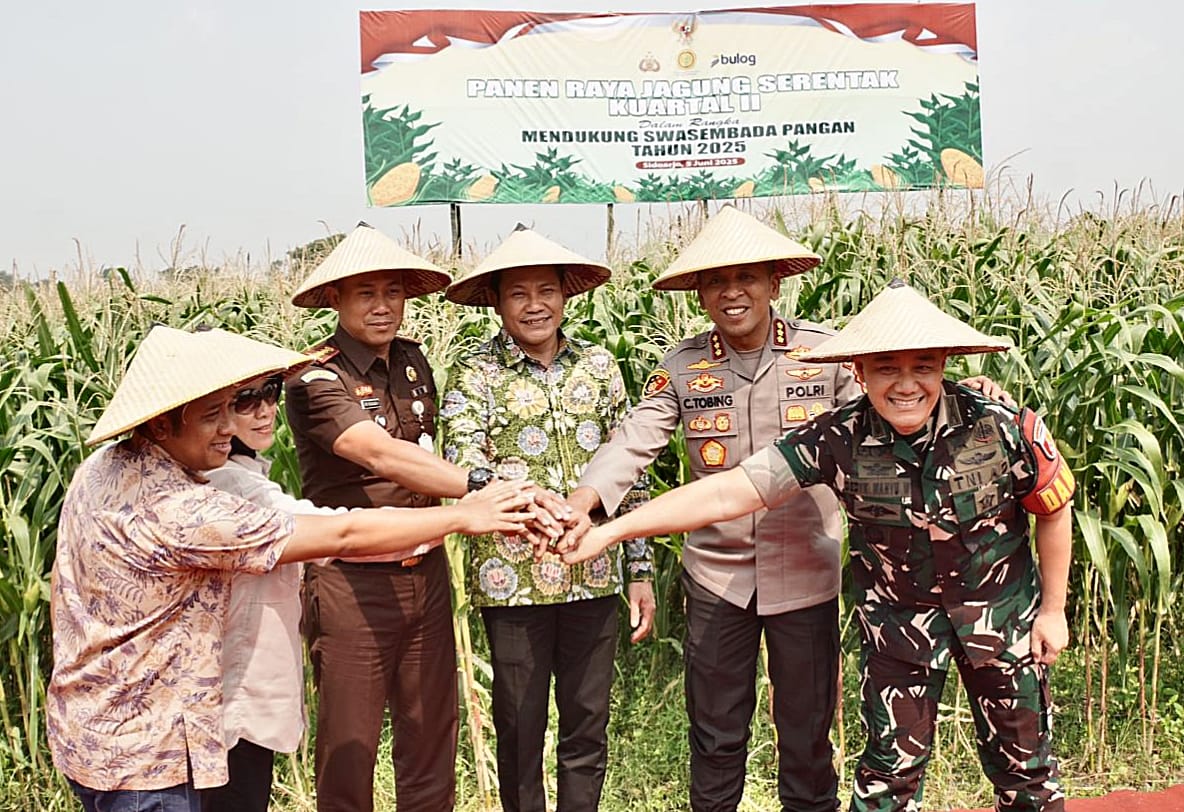 Komitmen Forum Komunikasi Pimpinan Daerah (Forkopimda) Kabupaten Sidoarjo dalam mendukung program swasembada pangan nasional yang dicanangkan Presiden RI Prabowo Subianto, diwujudkan lewat panen raya jagung serentak di Desa Pangkemiri, Kecamatan Tulangan, Kamis (5/6/2025).