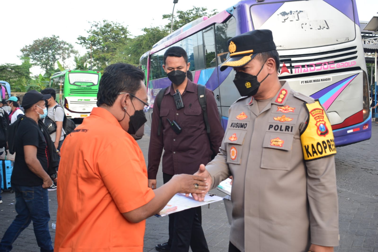 Mengecek situasi arus balik lebaran yang mulai bergeliat pada Jumat (6/5/2022) di Terminal Purabaya, Kapolresta Sidoarjo Kombes Pol. Kusumo Wahyu Bintoro turun langsung ke lokasi. Juga berkomunikasi dengan sejumlah kru bus dan berikan himbauan kamtibmas ke penumpang.