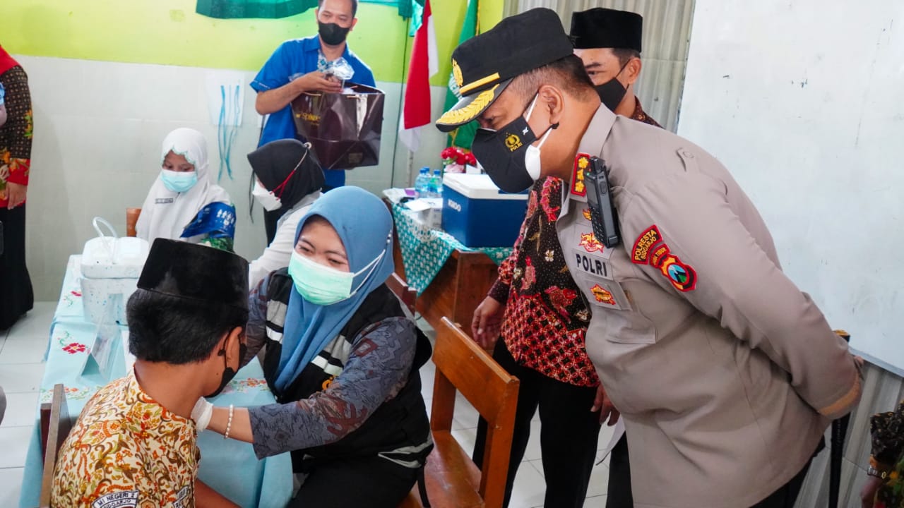 Kapolresta Sidoarjo Kombes Pol. Kusumo Wahyu Bintoro, Rabu (12/1/2022) pagi, mengecek pelaksanaan vaksinasi Covid-19 dosis kedua bagi anak usia 6 sampai 11 tahun di Madrasah Ibtidaiyah (MI) Negeri 2, Sedati, Sidoarjo.