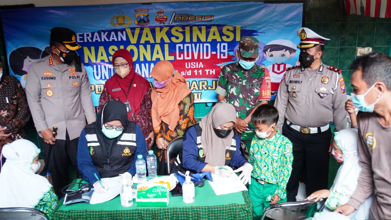 Vaksinasi Merdeka Anak terus dimasifkan Polri bersama pihak terkait. Termasuk digencarkan Polresta Sidoarjo, dengan menyasar anak sekolah usia 6 sampai 11 tahun.