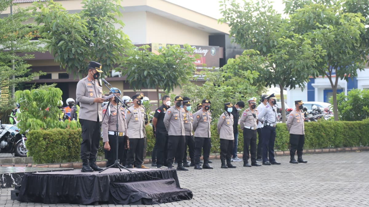 Kapolresta Sidoarjo Kombes Pol. Kusumo Wahyu Bintoro, Minggu (1/5/2022), memimpin Apel Gelar Pasukan Pengamanan Malam Hari Raya Idul Fitri 2022 di Mapolresta Sidoarjo.