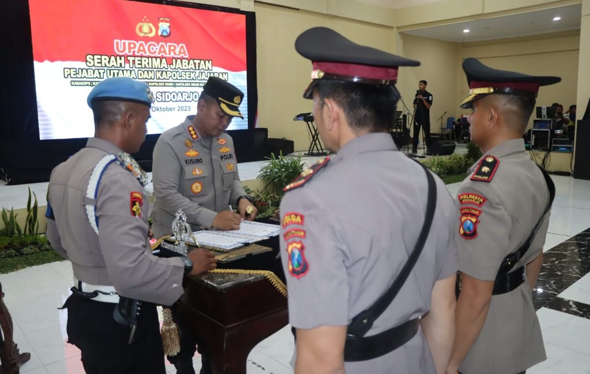 Ditandai dengan upacara serah terima jabatan (sertijab) dipimpin Kapolresta Sidoarjo Komisaris Besar Polisi Kusumo Wahyu Bintoro, Senin (9/10/2023) di Gedung Serbaguna Polresta Sidoarjo.