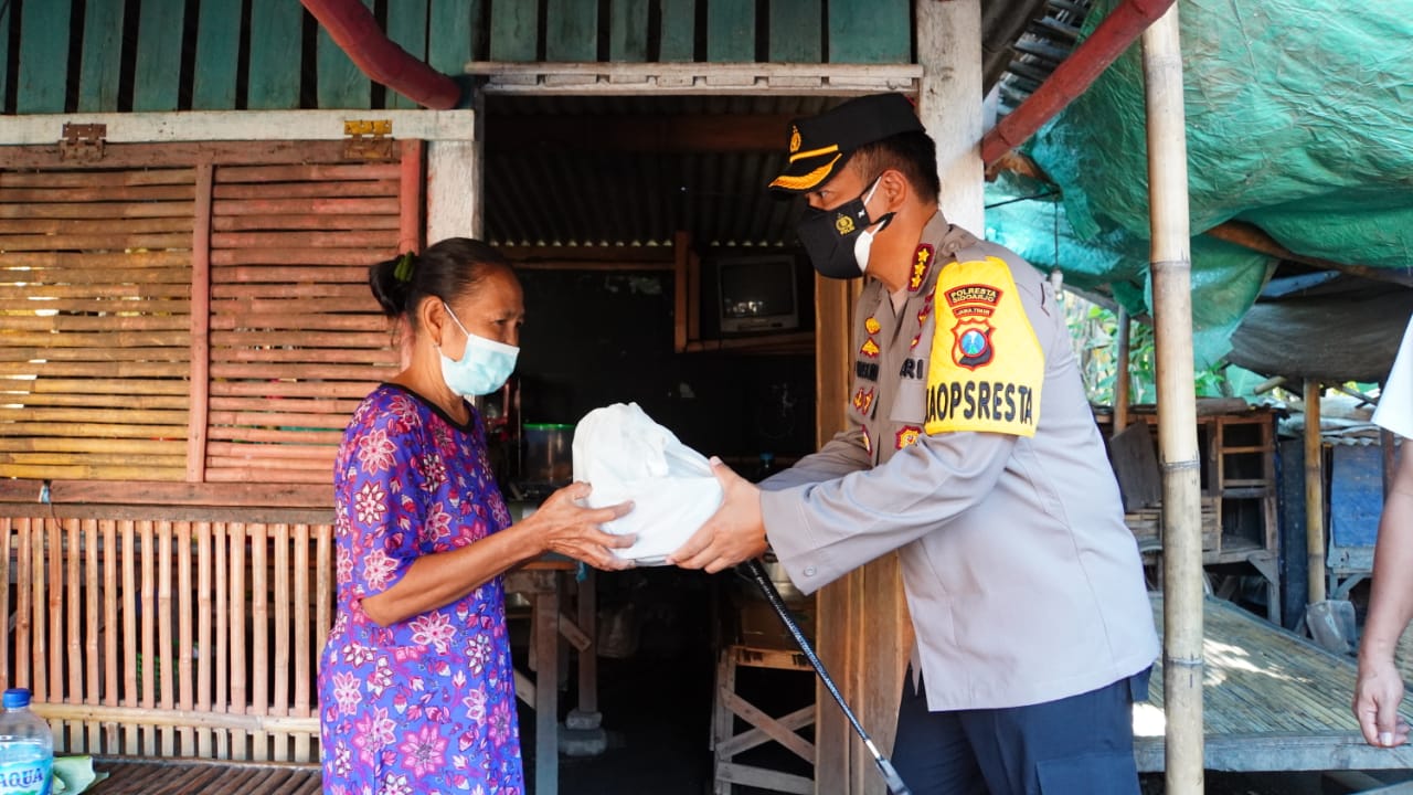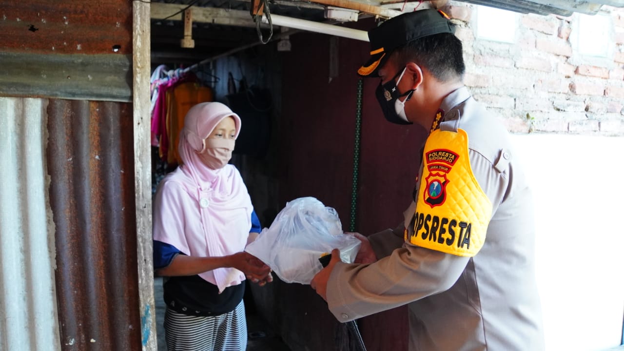 Polresta Sidoarjo bagikan daging qurban secara door to door untuk warga kurang mampu yang terdampak adanya pandemi Covid-19, dilakukan tepat perayaan Hari Raya Idul Adha 1442 Hijriyah, Selasa (20/7/2021). Pembagian daging qurban ini juga dilakukan serentak oleh polsek jajaran, serta melibatkan seluruh bhabinkamtibmas Sidoarjo.