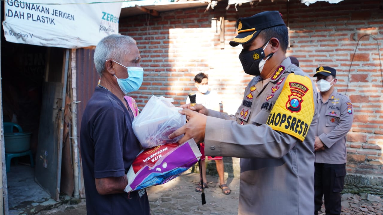 Polresta Sidoarjo bagikan daging qurban secara door to door untuk warga kurang mampu yang terdampak adanya pandemi Covid-19, dilakukan tepat perayaan Hari Raya Idul Adha 1442 Hijriyah, Selasa (20/7/2021). Pembagian daging qurban ini juga dilakukan serentak oleh polsek jajaran, serta melibatkan seluruh bhabinkamtibmas Sidoarjo.