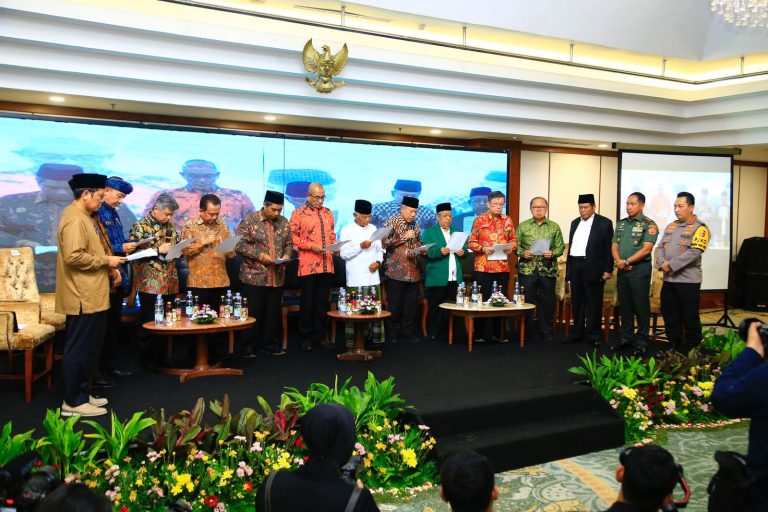 Deklarasi Pemilu Damai ini diprakarsai oleh Majelis Ulama Indonesia (MUI), diikuti 87 organisasi lintas agama dan majelis agama di bawah naungan MUI dengan mengangkat tema “Mengawal Pemilu Damai, Jujur, Adil, Bermartabat”.
