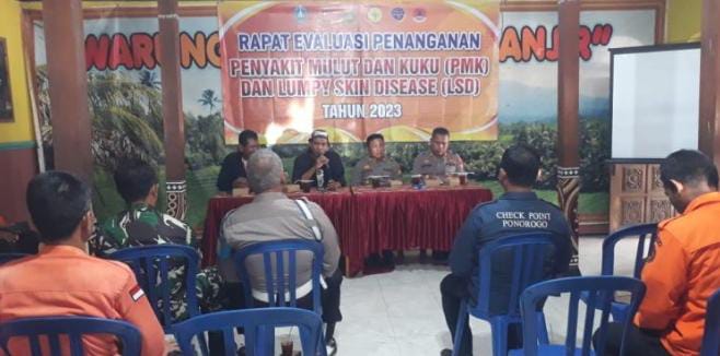 Kapolsek Badegan bersama anggota melaksanakan kegiatan rapat evaluasi penanganan penyakit mulut dan kuku (PMK) serta Lumpy Skin Disease (LSD) bertempat di warung Makan Pak Banjir Sumoroto, Senin (7/8/2023) pukul 09.00 wib.