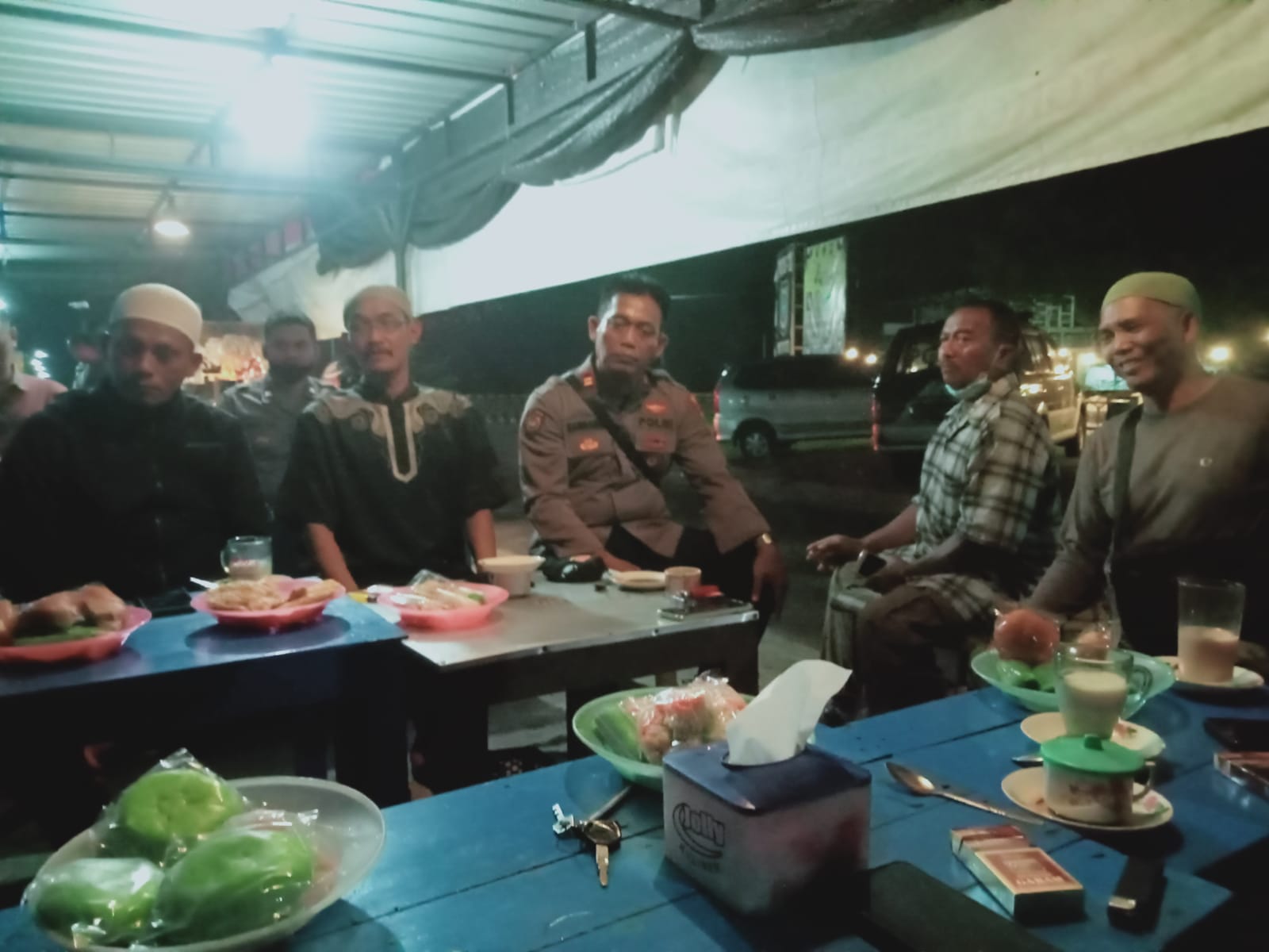 Madiun – Kapolsek dolopo Ajun Komisaris Polisi (AKP) Agus ekoyono SH wakapolsek IPTU Bambang Tri dan kanit Intelkam AIPTU Kunto Widodo,..menghadiri cangkrukan Anggota Kampung Pesilat Dolopo, di Angkringan tugu tawang dolopo Kabupaten Madiun, Sabtu (15/10/2022) malam.