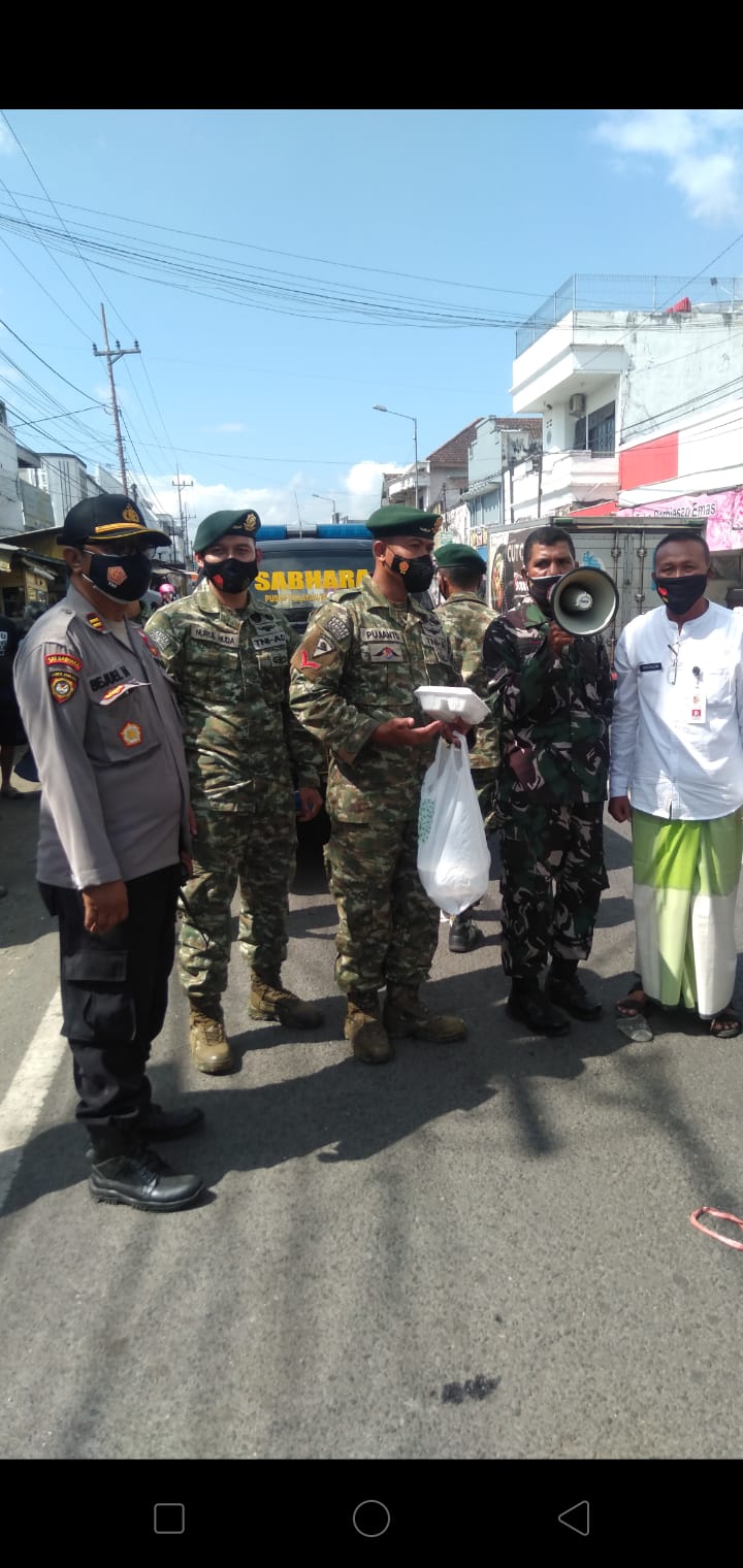 Kapolsek Mayang Bersama TNI bagi bagi Nasi Kotak.sekaligus Sosialisasi untuk selalu memakai Masker.