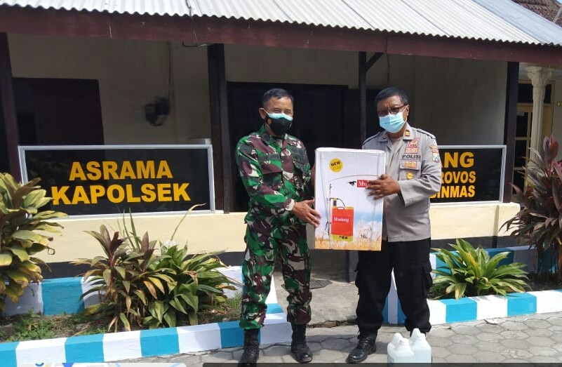 Kapolsek Mayang Sumbang Satu Unit Alat Semprot dan Cairan Disinfektan kepada Koramil 0824 Mayang