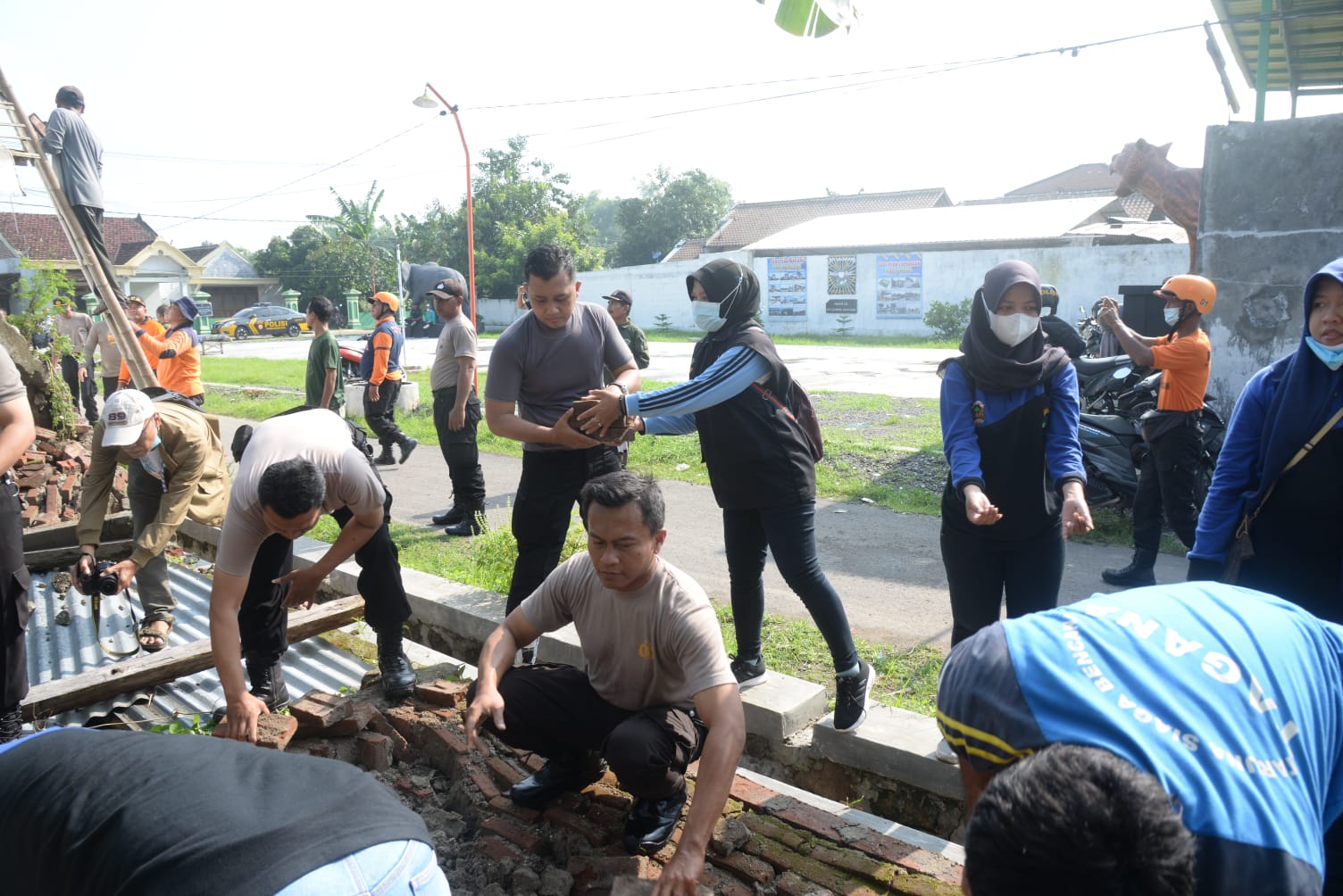 Kapolsek Sawahan AKP Yulis Hari Rahmanto, SH., MH. memimpin kegiatan kerja bakti gotong royong membersihkan dan membenahi reruntuhan yang terdampak oleh kejadian bencana alam hujan deras disertai angin kencang Kamis, (15/12/2022).