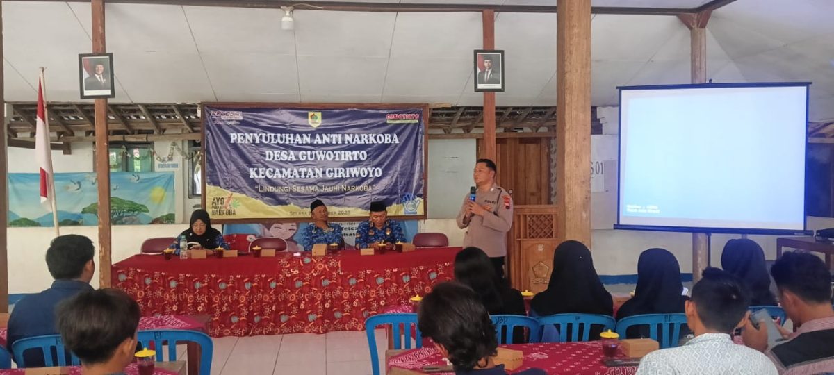 Upaya pencegahan penyalahgunaan narkoba terus digencarkan di wilayah Kabupaten Wonogiri. Kali ini, Polsek Giriwoyo bersama UPT Puskesmas Giriwoyo 1 menggelar kegiatan Penyuluhan Anti Narkoba dengan tema “Lindungi Sesama, Jauhi Narkoba” di Balai Desa Guwotirto, Kecamatan Giriwoyo, Selasa (28/10/2025) pagi.