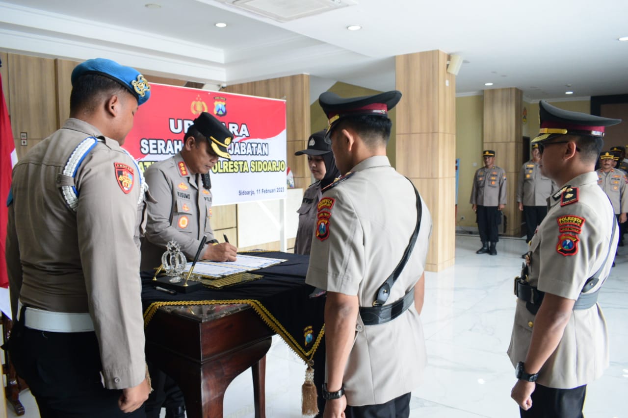 Kapolresta Sidoarjo Komisaris Besar Polisi Kusumo Wahyu Bintoro, Sabtu (11/2/2023), pimpin serah terima jabatan Kasat Intelkam Polresta Sidoarjo di ruang lobi Mapolresta Sidoarjo.