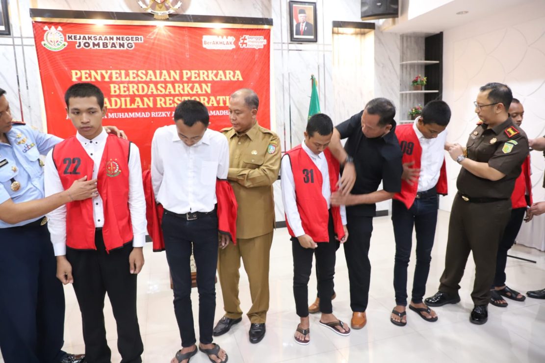 Pj Bupati Jombang Sugiat dan Kepala Kejaksaan Negeri (Kajari) Jombang saat melepas rompi tahanan pada 7 orang tahanan kasus pengeroyokan dan penganiayaan setelah mendapatkan Restorative Justice atau Keadilan Restoratif. | Foto: Ist