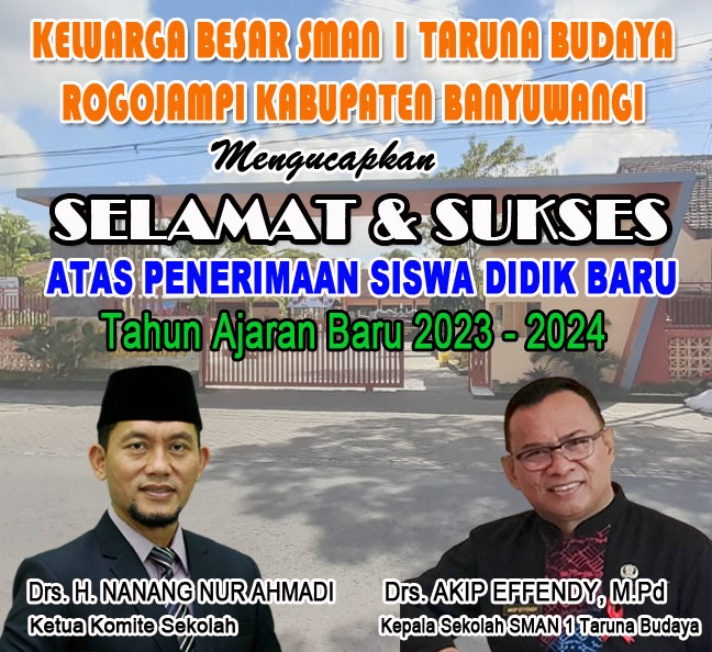 KELUARGA BESAR SMAN 1 TARUNA BUDAYA ROGOJAMPI KABUPATEN BANYUWANGI Mengucapkan SELAMAT & SUKSES atas Penerimaan Siswa Didik Baru Tahun Ajaran 2023 – 2024