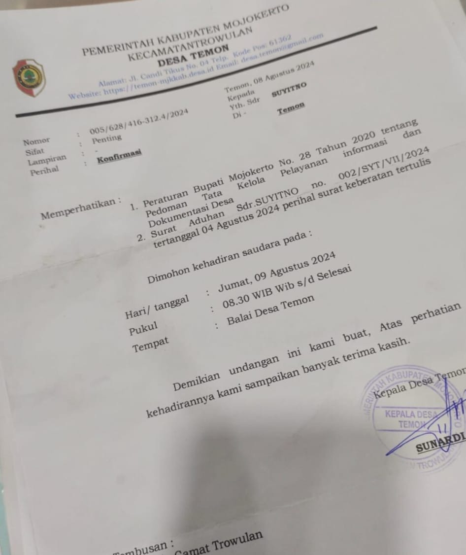 Sementara itu Dalam Relise yang diterima media ini, warga Temon Suyitno menjelaskan perkara yang dialaminya bermula saat dirinya mendapat surat undangan dari Kepala Desa Temon, Sunardi untuk hadir di Balai Desa Temon pada Jumat (9/08/2024) Pukul 08.30 WIB perihal konfirmasi sebagaimana tertuang dalam Surat Pemerintah Desa Temon Nomor:005/628/416-312.4/2024 yang ditandatangani oleh Kepala Desa Temon, Sunardi pada 8 Agustus 2024.