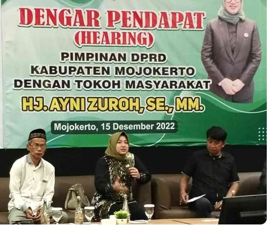 Untuk menyerap Aspirasi Masyarakat di Kabupaten Mojokerto, Ketua DPRD Kabupaten Mojokerto ( Pimpinan Dewan ) Hj. Ayni Zuroh, S.E., M.M. mengadakan dengar pendapat (Hearing) dengan para tokoh masyarakat yang ada di Kabupaten Mojokerto, Kamis (15/12/2022) di Lynn Hotel Mojokerto.