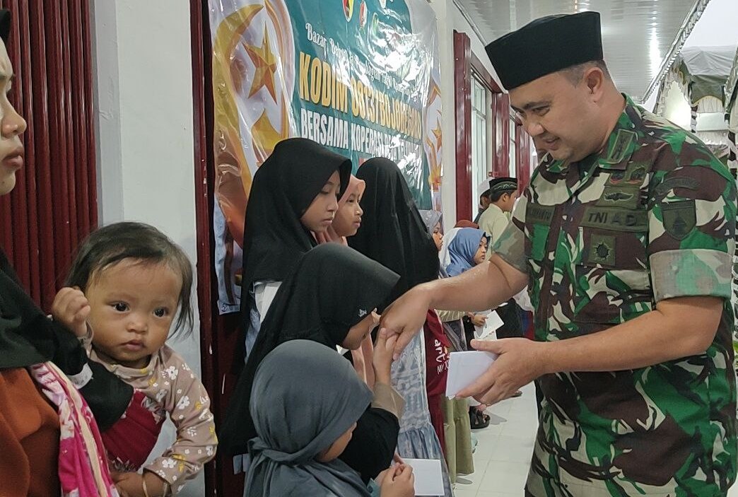 Kodim 0813 Bojonegoro menggelar kegiatan bazar murah, serta bakti sosial santunan kepada anak yatim dan dhuafa dihalaman Koperasi Desa/Kelurahan Merah Putih (KDKMP) Desa Pungpungan Kecamatan Kalitidu Kabupaten Bojonegoro, Senin (2/3/2026).