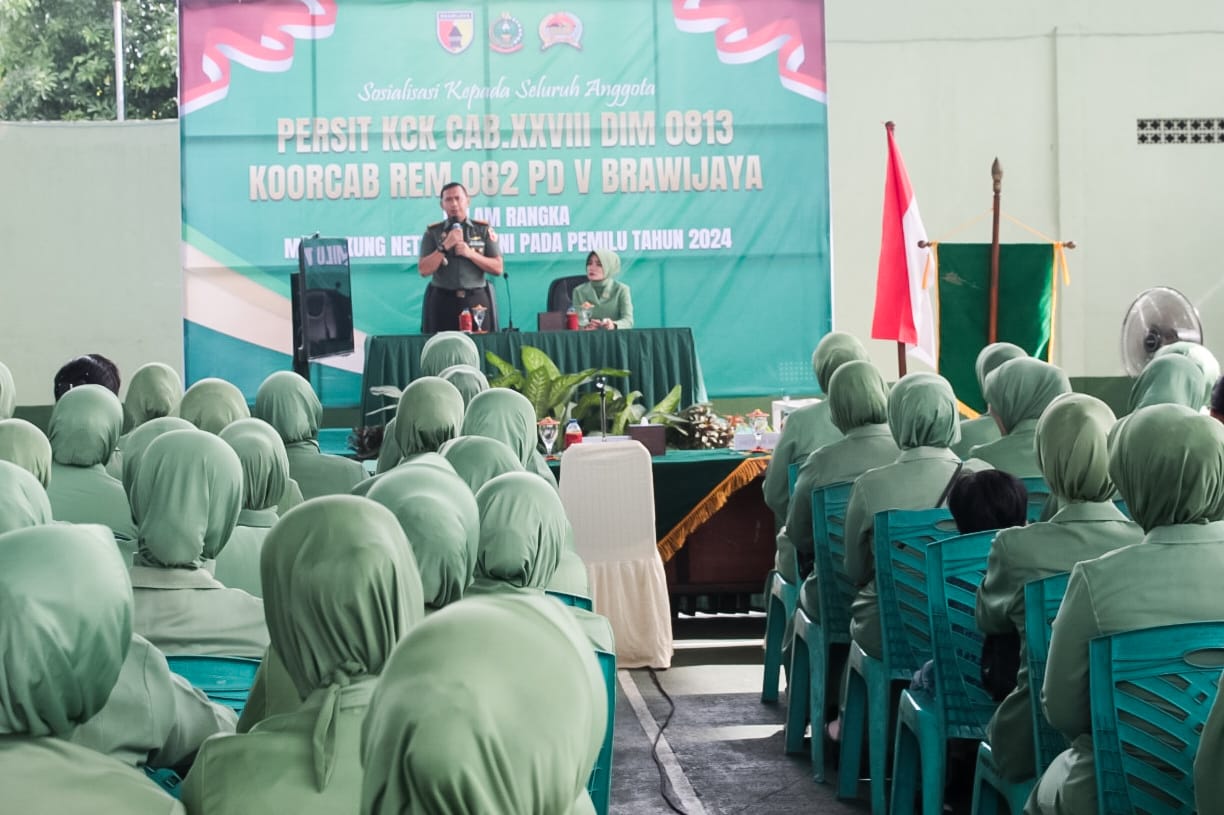 Komando Distrik Militer (Kodim) 0813 Bojonegoro, Jawa Timur, pagi ini Rabu (24/1/2024), menggelar sosialisasi netralitas Pemilu 2024 kepada jajaran Persit Kartika Chandra Kirana (KCK) Cabang XXVIII Kodim 0813 Bojonegoro Koorcabrem 082/CPYJ PD V/Brawijaya di Gedung Ahmad Yani Markas Kodim setempat.