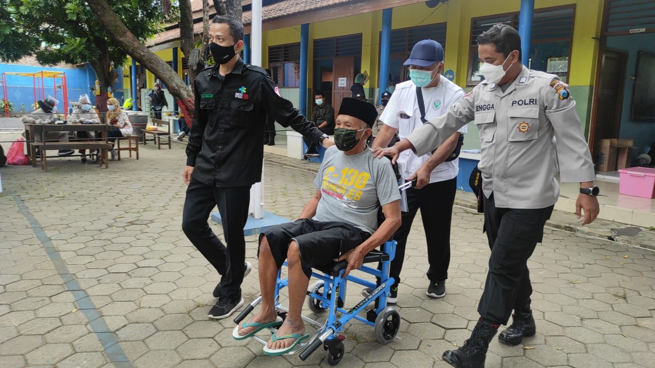 Suwadi dengan tubuh rentanya dibantu berjalan perlahan bersama putranya serta anggota Bhabinkamtibmas Polsek Pakis, datang ke lokasi vaksinasi dengan penuh semangat.