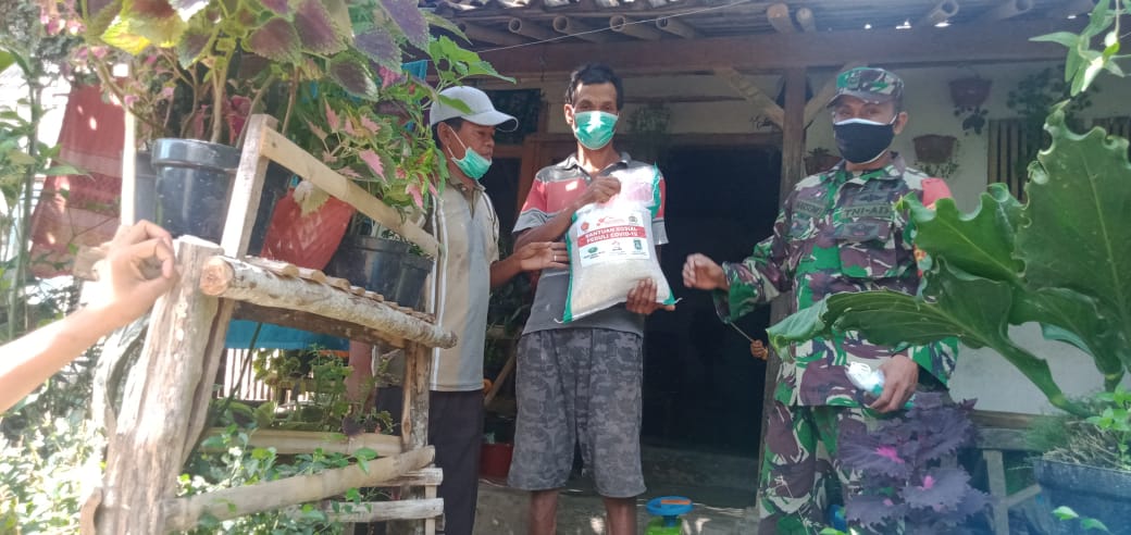 Koramil 0824/08 Mayang Diwakili Serda Harsono selaku babinsa Desa Tegalwaru berperan aktif dalam kegiatan pembagian sembako gratis kepada warga terdampak Covid-19 yang di selenggarakan oleh koramil 0824/08 Mayang.di dusun klayu Rt 01 sampai RW 2 desa tegalwaru Kec mayang, jumat (20/juli/2021).
