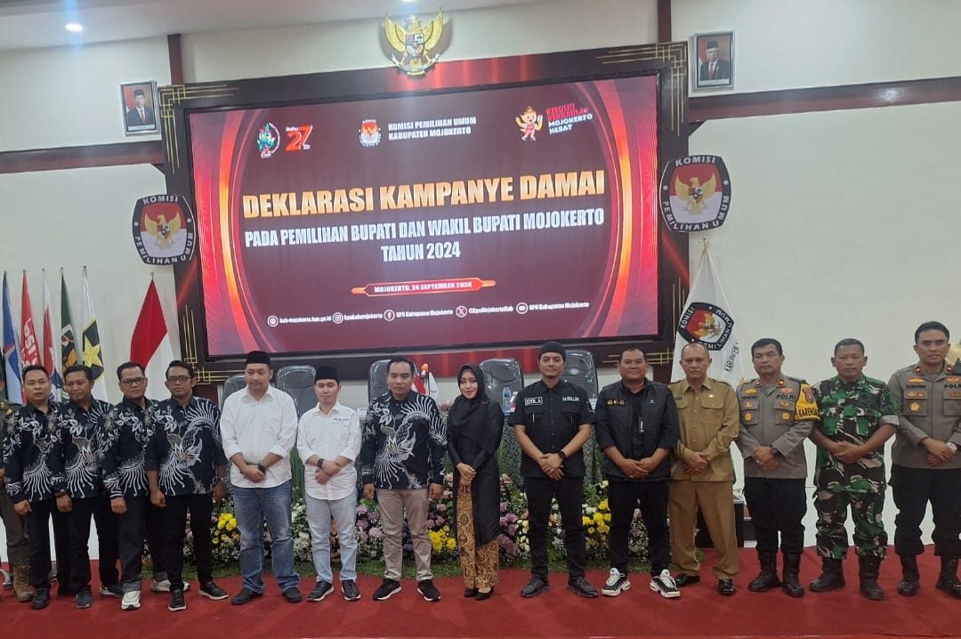 Setelah sukses dan lancar melaksanakan pengundian nomor urut pasangan Calon Bupati dan Wakil Bupati, giat selanjutnya Komisi Pemilihan umum (KPU) Kabupaten Mojokerto, melanjutkan tahapan berikutnya, yaitu Deklarasi Kampanye Damai di Gedung Pemilu Jalan RAAK Adinegoro no. 1-2 Sooko Mojokerto, pada Selasa, (24/9/2024) Siang yang diikuti oleh kedua pasangan Calon.