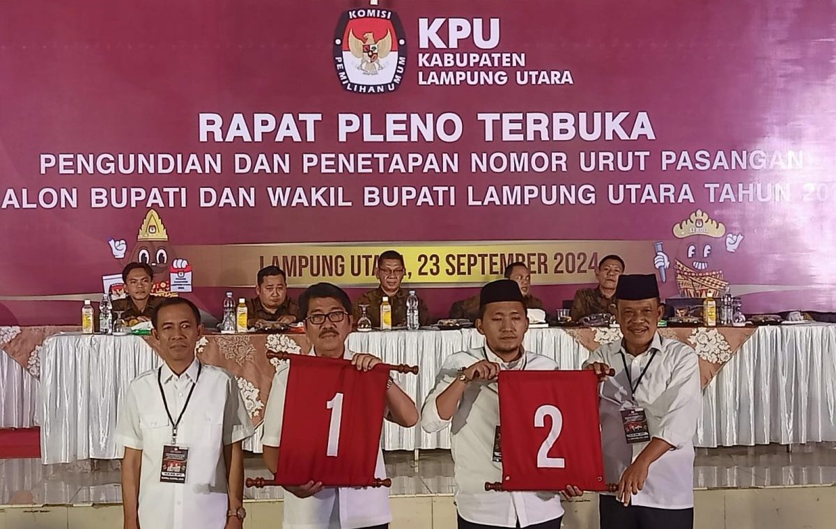 Komisi Pemilihan Umum (KPU) Lampung Utara, menyelenggarakan Rapat Pleno Terbuka Pengundian dan Penetapan Nomor Urut Pasangan Calon Bupati dan Wakil Bupati Lampura Tahun 2024 di Gedung Islamic center Kotabumi, Lampung Utara, Senin 23 September 2024