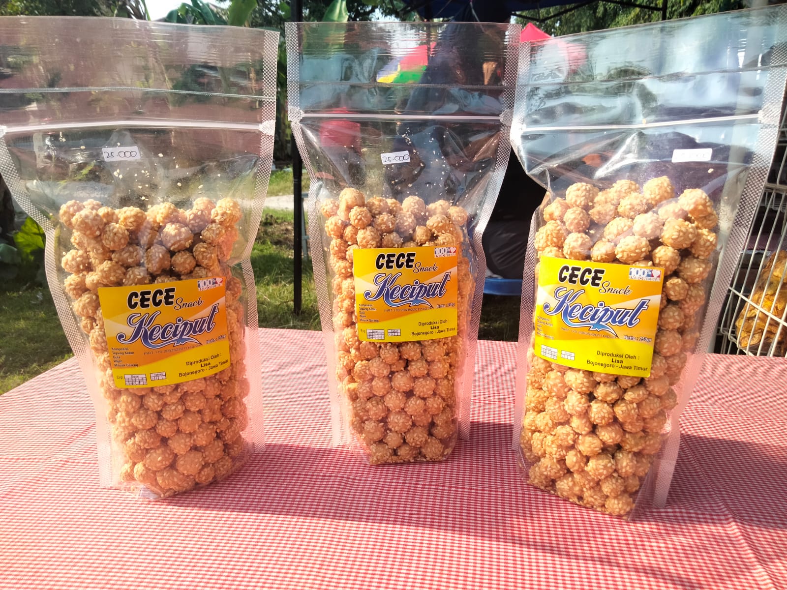 “Kue ini polos tanpa isian dan bagian luarnya berbalur biji wijen. Komposisi tepung ketan, telor, gula, wijen, minyak goreng. Juga sudah mencantumkan nomor P-IRT, tanggal kadaluarsa dan keterangan halal. Harga kemasan 250 gram Rp 25.000,” jelasnya.